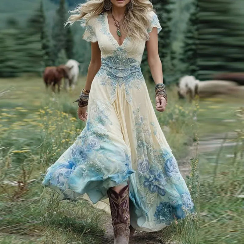 Sexy Retro Ethnic V Neck Long Dress Woman Elegant Boho Print A-Line Spliced Maxi Dress Summer Short Sleeve Holiday Evening Dress