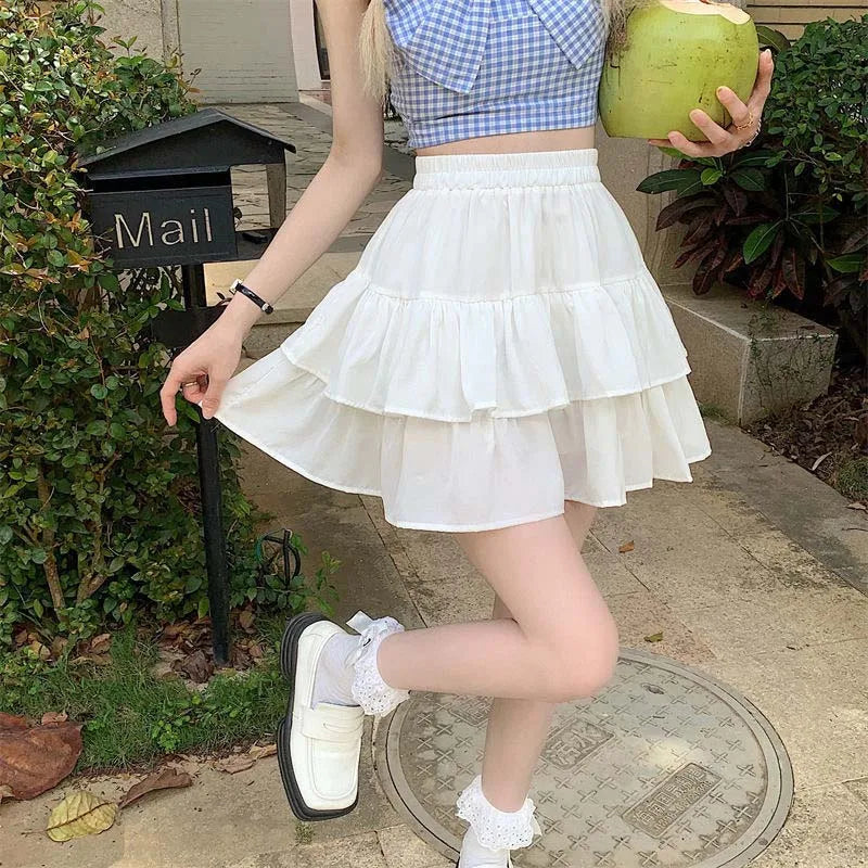 Pleated A-Line Skirt Women White Ruffle Sweet Tierred Pretty Style Skirt Elastic Waist Summer Slim Basic Korean Harajuku Dress