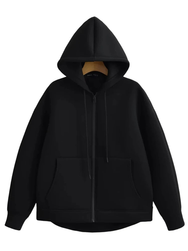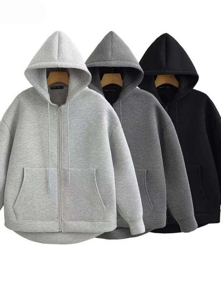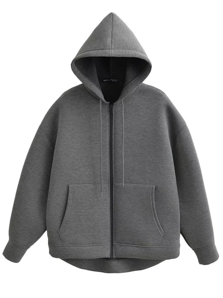 T Autumn Women Gray Jacket With Hood Long Sleeve Big Pocket Zipper Jacket Coat Woman Loose Casual Outerwear Coat Tops