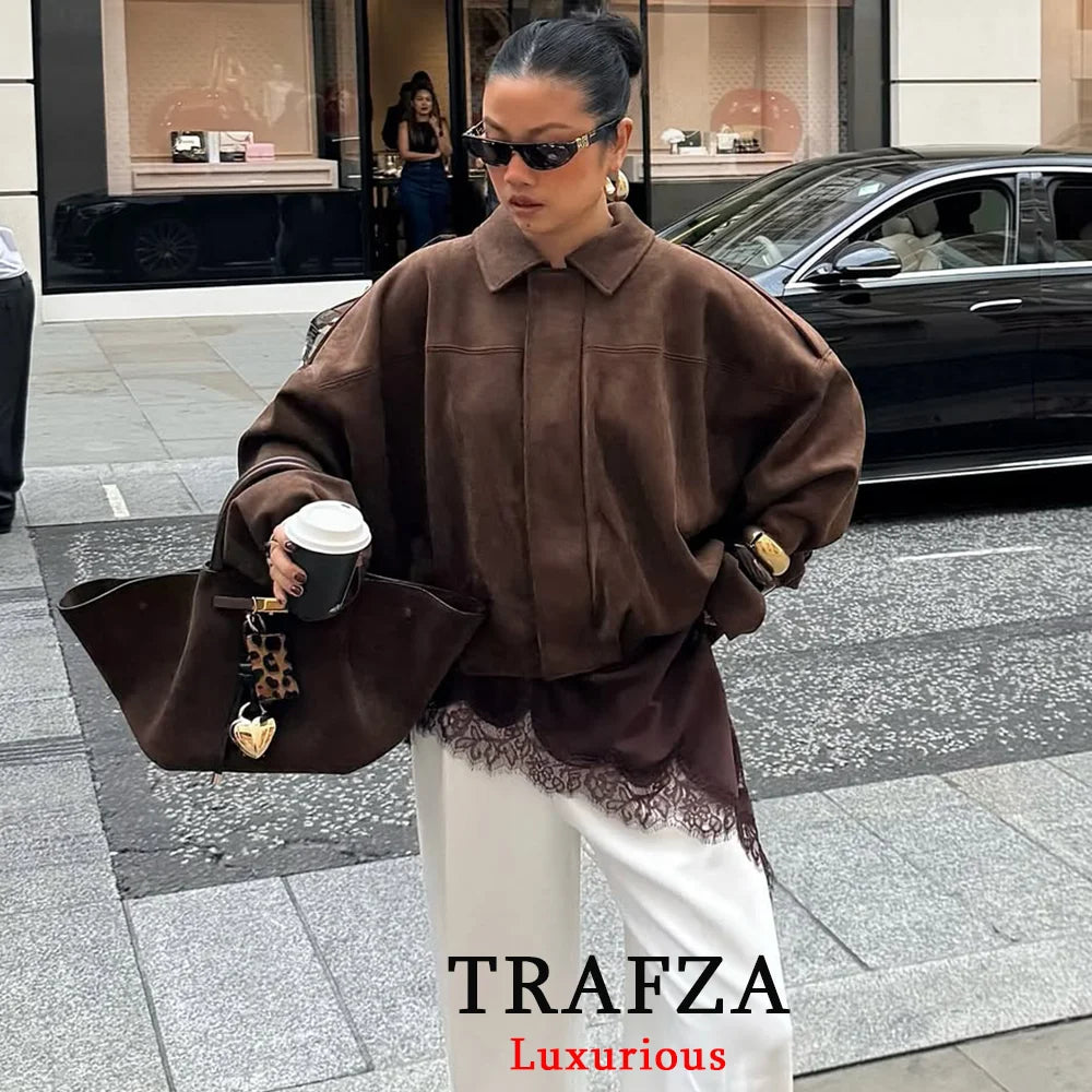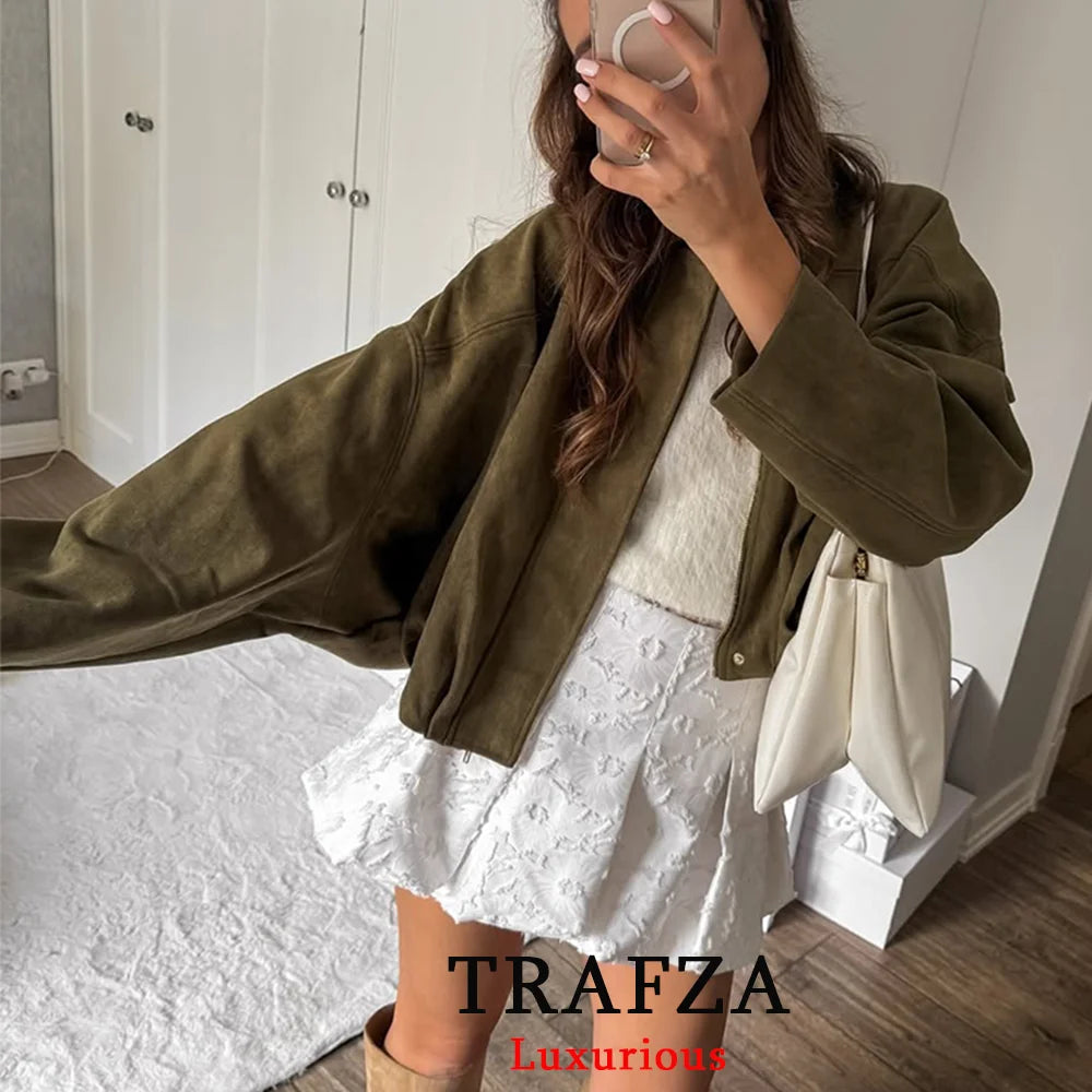 TRAFZA Casual Soft Bomber Jackets Women Long Lantern Sleeve Oversized Autumn Winter Coats Fashion 2025 Streetwear Zipper Outwear