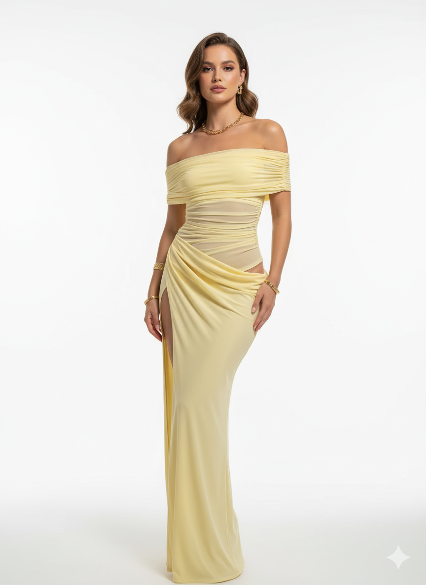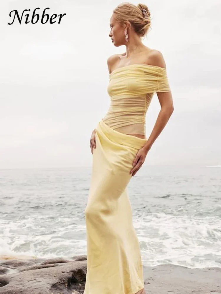 Nibber Ruched Irregular Dress Women Mesh Patchwork Slash Neck Short Sleeve Skinny Stretch Trend Elegant Long Bodycon Outfits