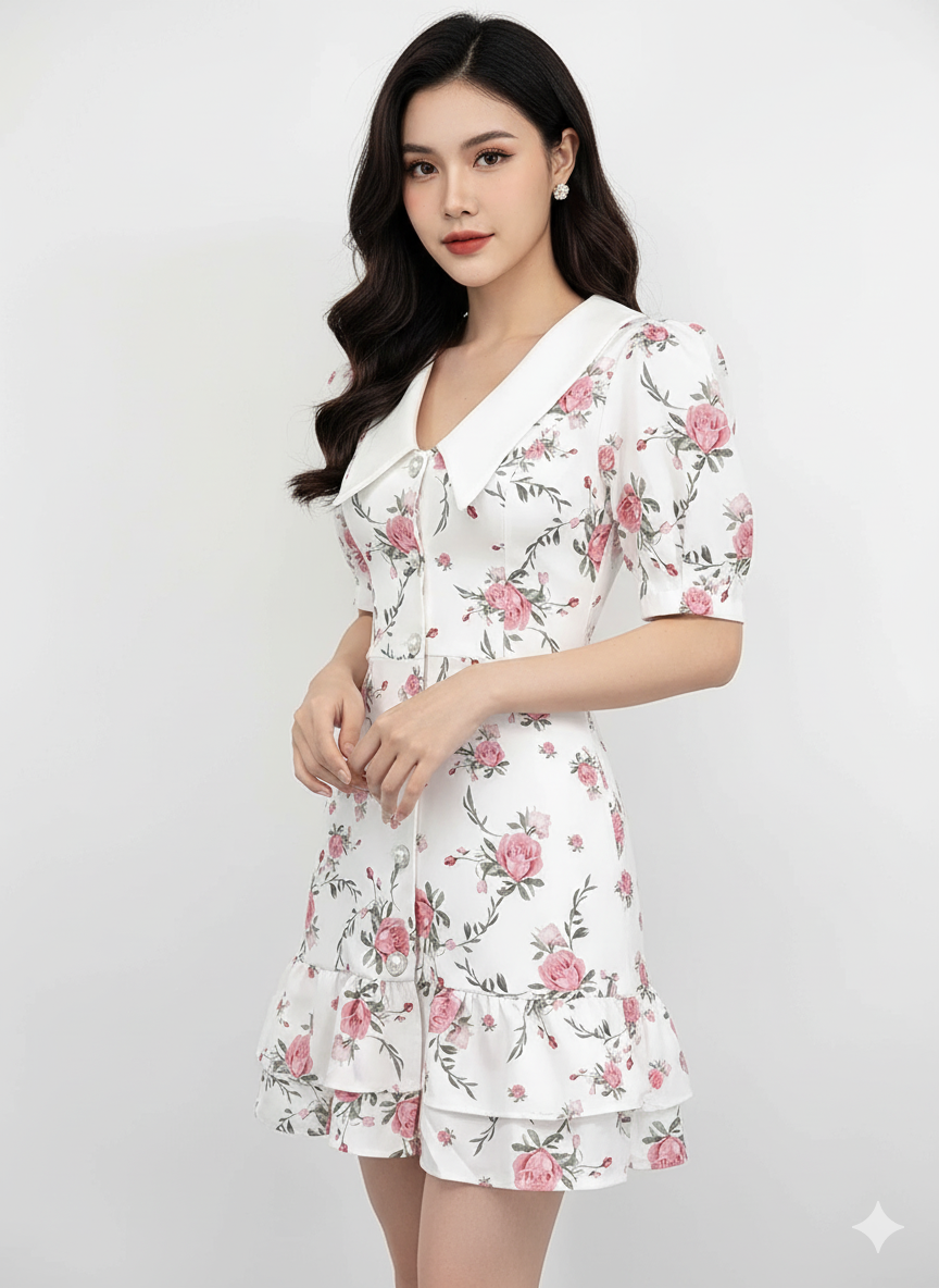 Tornova Print Puff Sleeves Ruffled Dress Women's V-Neck High Waist Pearl Buttons Mini Dress Female Casual Vacation Fashion Dress