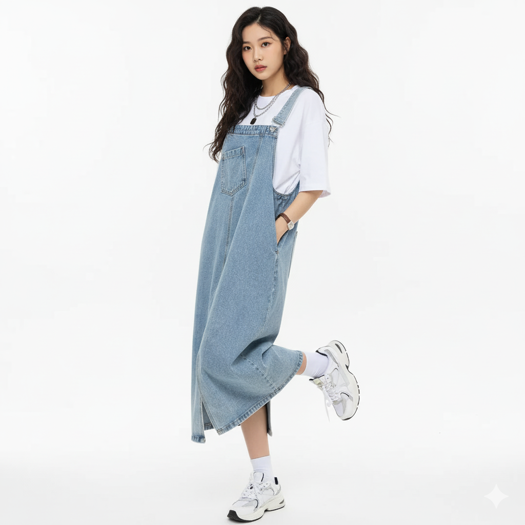 Women Denim Overall Dress Irregular Chest Pocket Side Split Fashion Sleeveless Jeans Dress Spaghetti Strap Dresses Jumper Dress