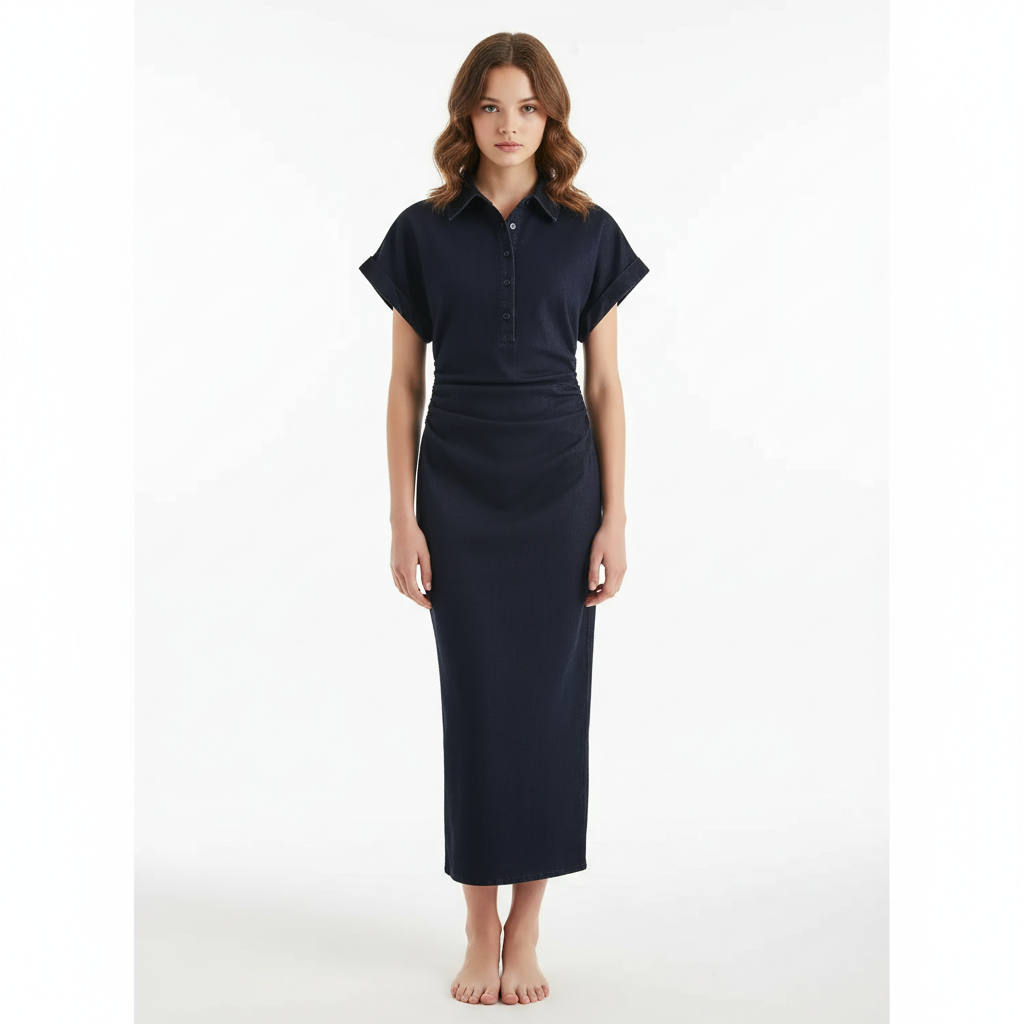 2025 Wansici Spring New 1975 series denim MIDI dress with lapel side zipper fashion wrinkle waist slim elegant dress