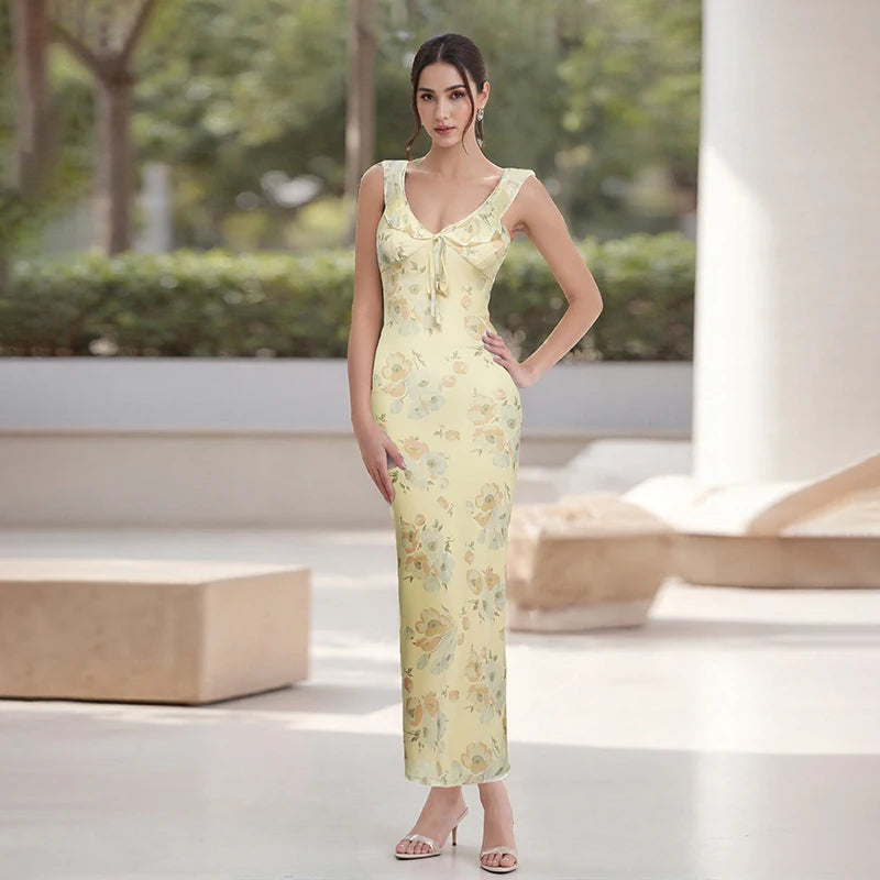 Women's Summer Flower Print Sexy Low-cut Dress Sleeveless Backless Slim Aesthetic Dresses 2025 Beach Vacation Lady Vestidos