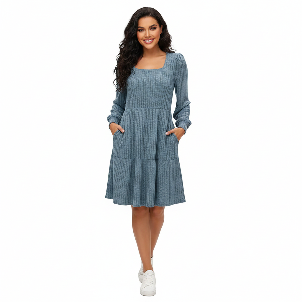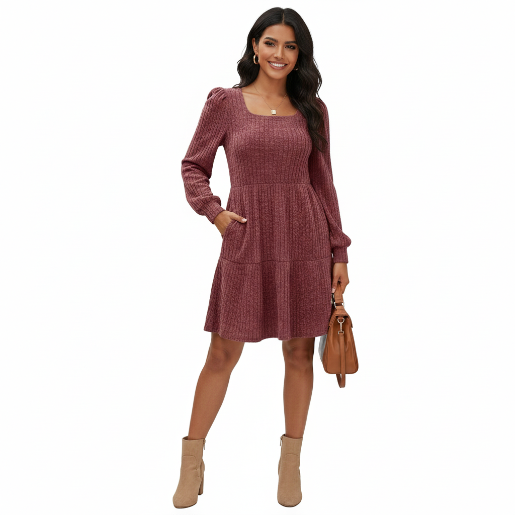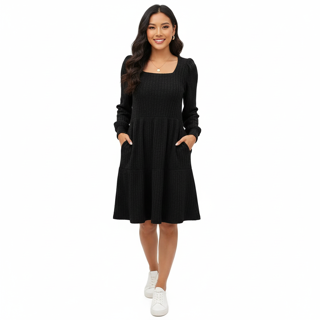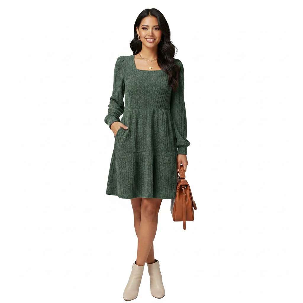 Womens Square Neck Long Sleeve Fall Dresses Casual Babydoll Sweater Dress