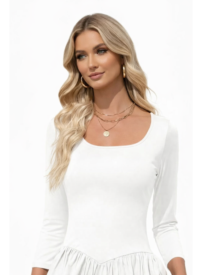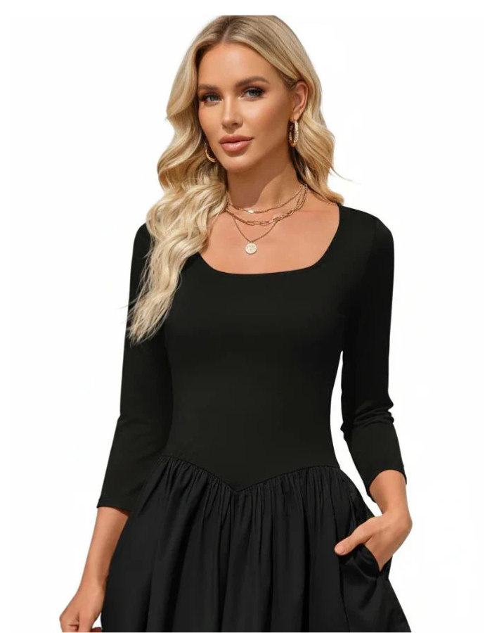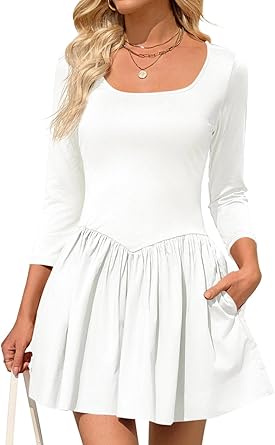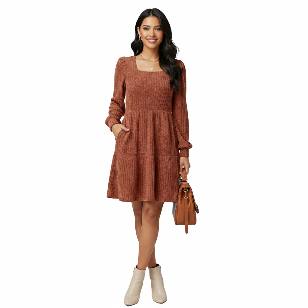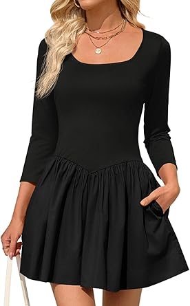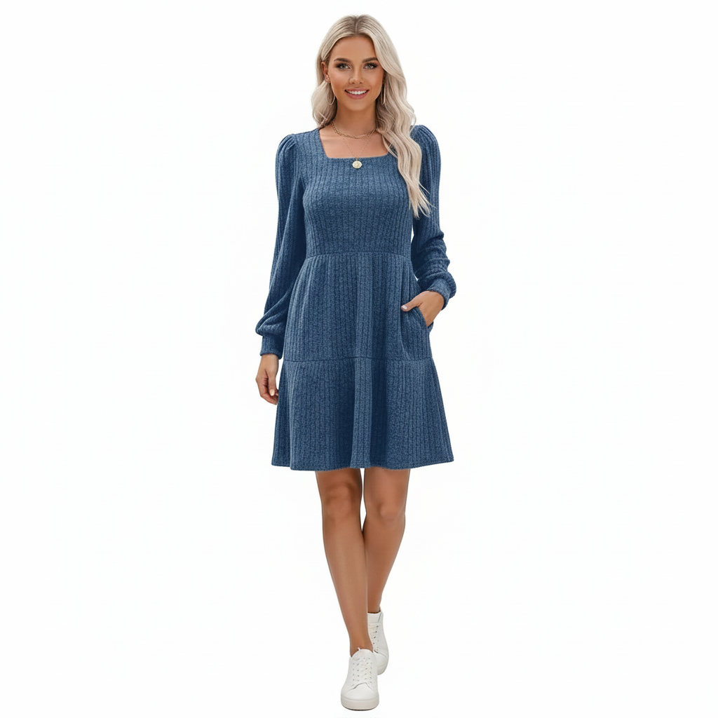 Womens Square Neck Long Sleeve Fall Dresses Casual Babydoll Sweater Dress