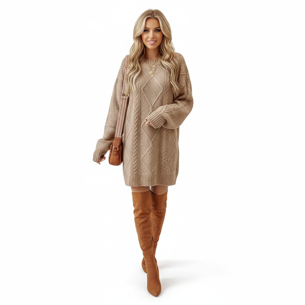 Women's Round Neck Long Sleeve Sweater Dress Casual Loose Fit Cable Knit Pullover Mini Dress