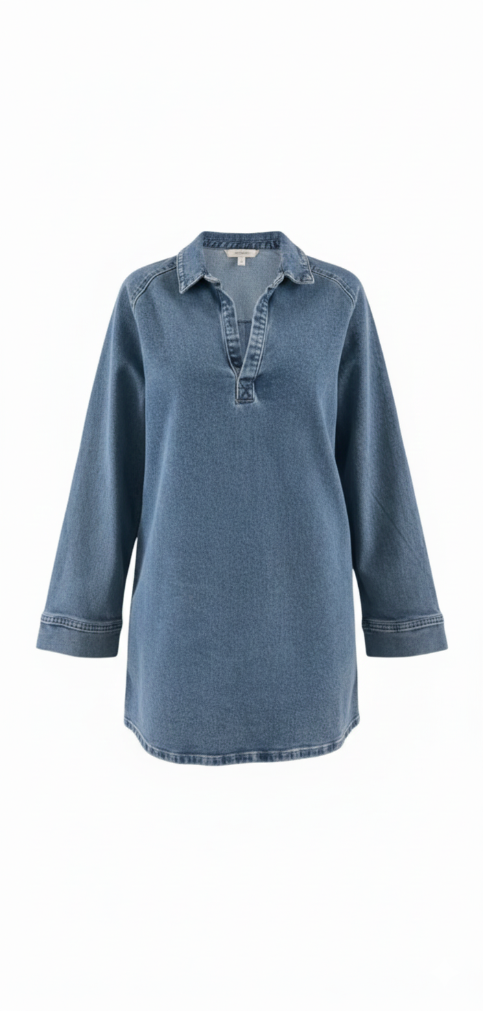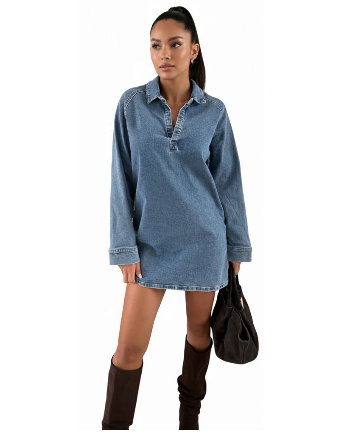 Women's Denim Dress Half-Zip Collared Vintage Washed Blue Loose Fit Long Sleeve One Chest Pocket Trendy Casual Top for Daily Wear & Street Style Looks - Chic Autumn and Winter - Womenswear Suitable for all people