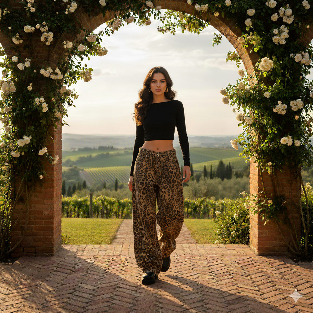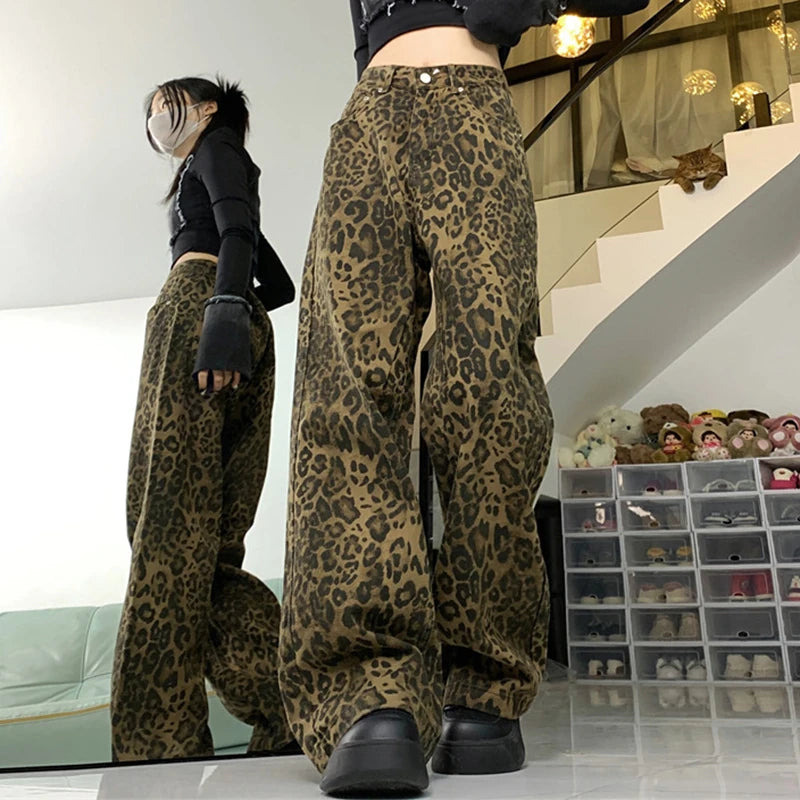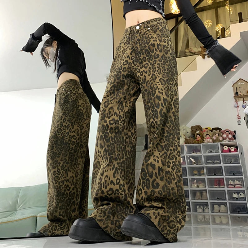 American Leopard Women Wide Leg Denim Pants High Street Spicy Girls Loose Straight Jeans Vintage High Waist Casual Long Trousers