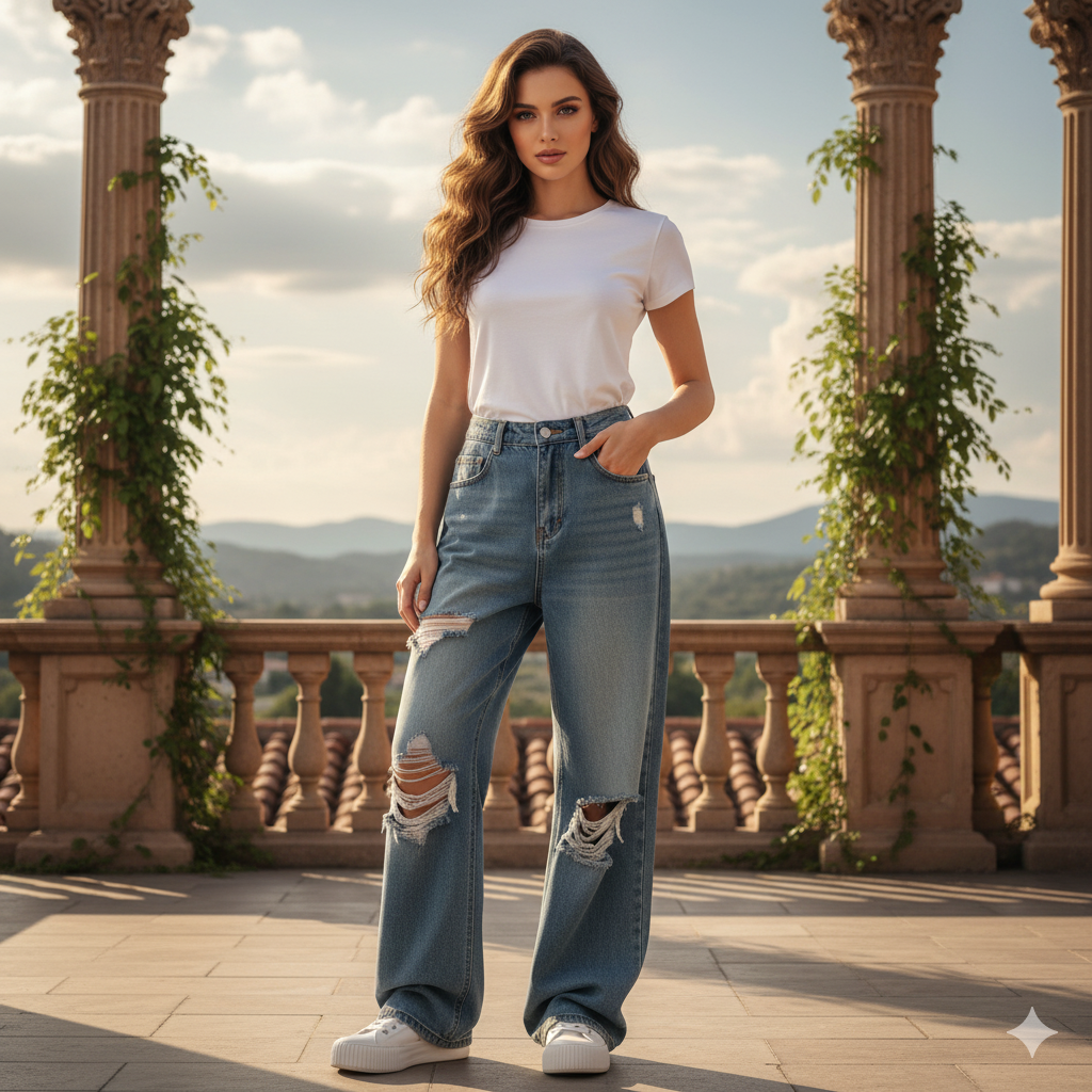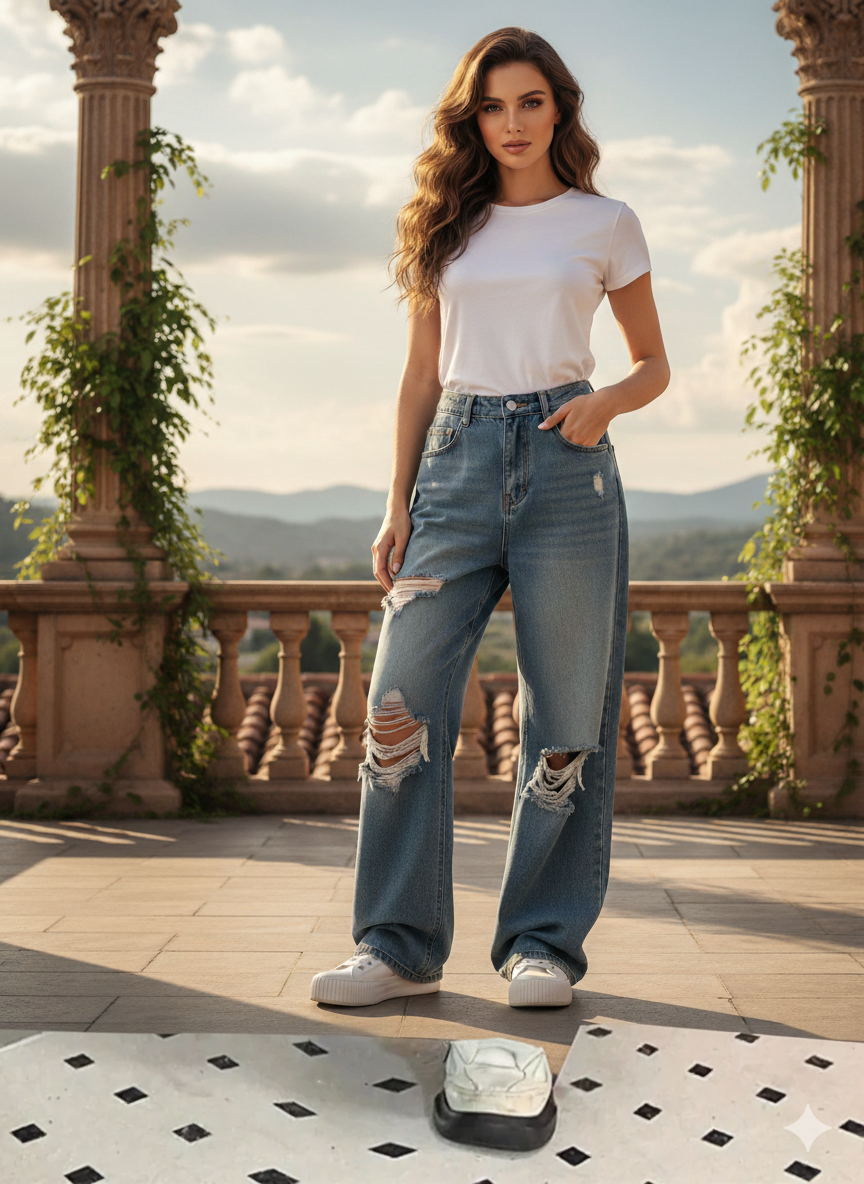 American Retro Hole-punched Jeans Women High Waist Straight-crotch Loose Slim Design High-street Vibe Wide-legged Dragging Pants