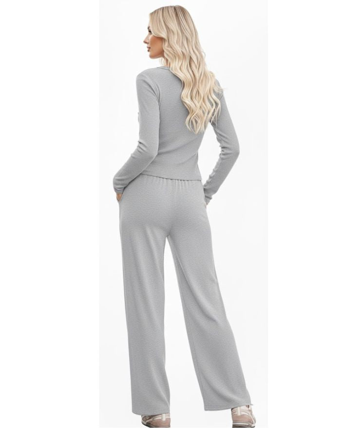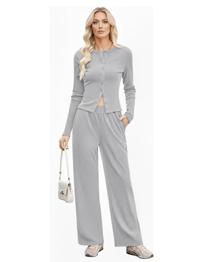 Two piece Set Women's Solid Button Front Ribbed Crop Top & Elastic Waist Pants Casual Long Sleeve Outfits for Spring & Fall Women's Clothes for Daily Wear Airport Outfit