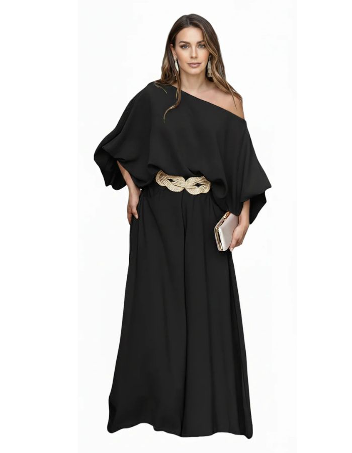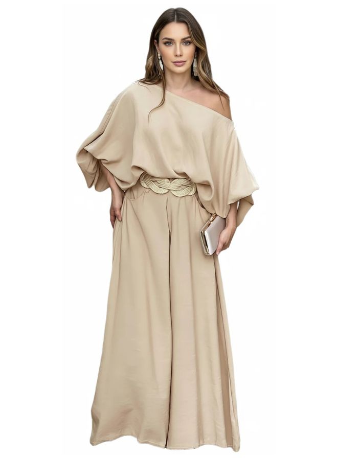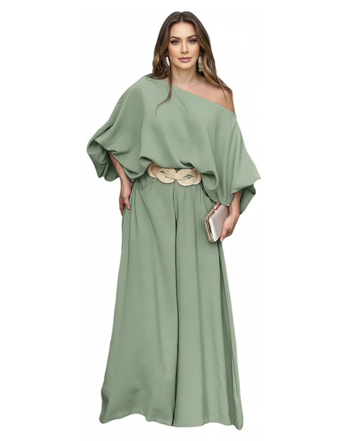 Women's Skew Neck Lantern Sleeve Top & Wide Leg Pants Set Perfect for Valentine's Day Wedding & Wedding Guest Looks